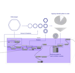 ![]() Simulations of 1km, 400m, and 150m craters of simple typologies generated from the code developed on Grasshopper. | ![]() Implanting modules in crater being tested | ![]() Part of the Grasshopper code created for the project |