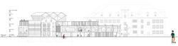 The school's entrance is relocated to the south, with the new wing elevated on columns to create an open ground floor housing a community room. Students are guided towards the historic courtyard, where they can ascend to classrooms via open stairs or access ground-floor day care facilities in the northwest direction. This design fosters connectivity between old and new while optimizing spatial flow for students and visitors alike.